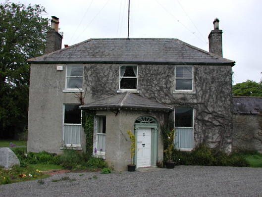 Detached three-bay two-storey house, c.1810, with projecting diagonally-set single-storey porch. Roughcast rendered walls. Single-pane timber sash windows. Timber panelled door with Ionic doorcase having radial elliptical fanlight. Hipped slate roof with brick chimney stacks. Lower two-storey rere section with lean-to slate roof forming catslide. Stone rubble outbuildings to rere in various states of dilapidation with pitched timber-framed slate roofs.