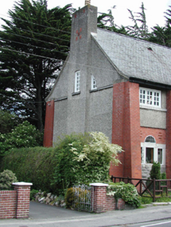 Detached six-bay two-storey public library, built 1912, with square-plan tower attached to southeast corner. Façade comprises horizontal bands of random limestone blocks, red brick and roughcast rendering with red brick buttresses and granite string course. Roughcast rendered east and west elevations. Metal casement windows to ground floor, set in groups of three with central semi-circular fixed light above. Timber casement windows to first floor. Timber door with carved stone hood and fanlight. Pitched slate roof with sprocketed eaves and roughcast rendered chimney stacks.