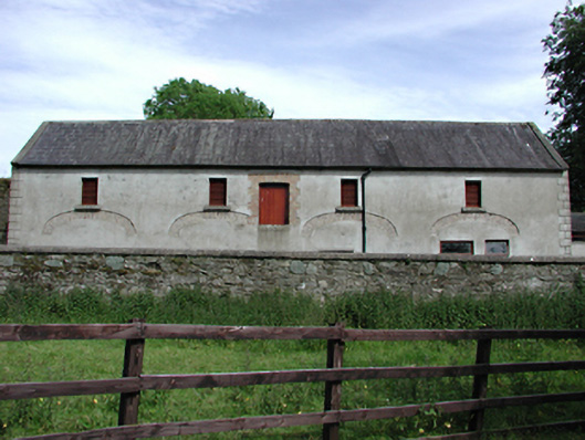 Detached four-bay double-height stable block, c.1800. Smooth rendered walls with render quoins. Brick three-centred arches and opening surround unrendered. Timber slats to upper openings. Replacement timber stable doors. Pitched slate roof.