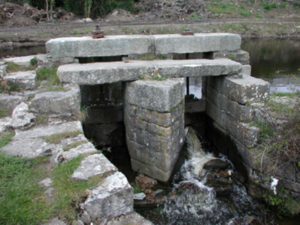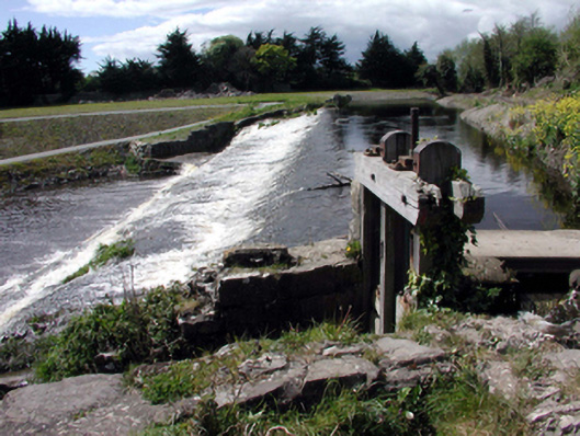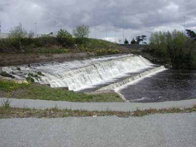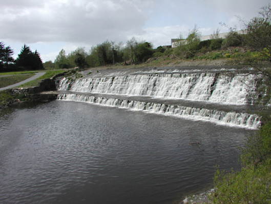 Weir set diagonally in River Dodder, c. 1775. Approximately 80 metres long set in three main stages from weir pool down to river, with an approximate drop of 10 metres. Group of sluice gates to weir and vicinity.