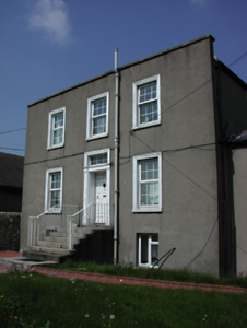 Detached corner-sited three-bay two-storey over basement Georgian house, c.1810, with single-storey over basement wing to east. Smooth rendered walls. uPVC casement windows with architrave surrounds. Timber panelled door with carved timber surround and uPVC overlight with architrave surround. Granite steps with cast-iron coal hole cover and simple iron railings. Hipped slate roof behind parapet. Joined at right-angles to later single-storey cottage to north.