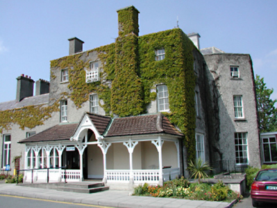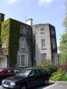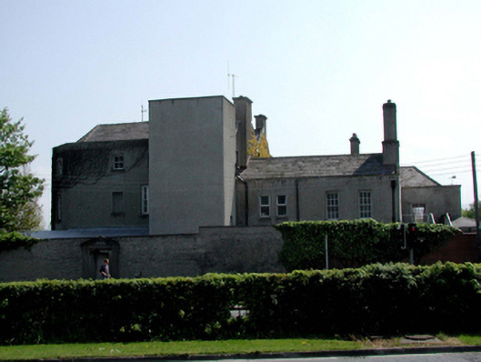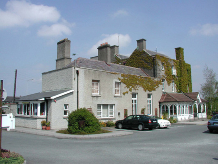 Detached three-bay three-storey former country house, c.1825. Full-height canted bay window to east end. Two two-storey wings to west end. Roughcast rendered walls. Timber sash and various replacement windows. Entrance under later full-width open timber porch with tiled roof. Hipped slate roofs behind parapets, with rendered chimney stacks. Extensions to rere. Redundant gateway to east and small blocked doorway in adjacent section of boundary wall.
