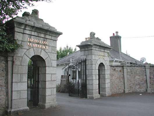 Entrance screen of former demesne, c.1845, now leading to museum. Simple cast-iron gates with flanking pedestrian gates in repointed ashlar granite archways surmounted by cornices and stone lions. Further flanking rubble stone quadrant screen walls with granite coping, tapering pilasters and ashlar terminating piers. Three-bay single-storey lodge set within. Rendered, ruled and lined walls. Timber casement windows in pointed openings. Gable-fronted glazed porch with carved bargeboards. Pyramidal slate roof with rendered chimney stacks.
