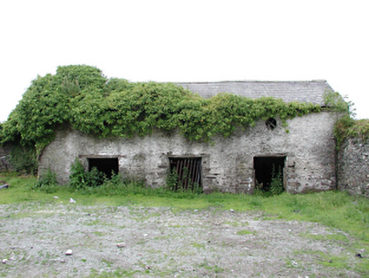 Detached three-bay two-storey animal shed, c.1800. Limestone rubble walls partially rendered. Openings to ground floor have timber lintels with circular openings to first floor. Pitched slate roof. Structure partially overgrown. Built in re-entrant corner of limestone rubble wall.