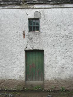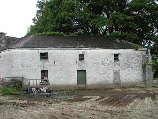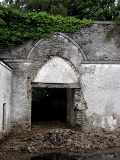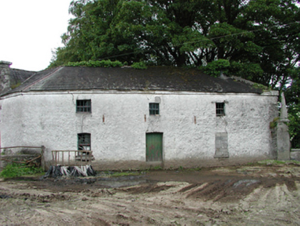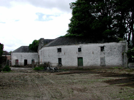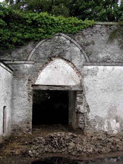 Detached multiple-bay two-storey former estate offices, c.1800, now partially used as animal sheds. The main structure is divided into two angled parts with roughcast rendered walls. Timber sash windows with stone sills and timber door, several openings blocked. Hipped slate roof. Partially blocked double-height pointed-arched opening with granite string course mirroring arch incorporated into north-west of former offices. Three-bay single-storey block attached to south-west elevation, adjacent to arch, in similar style to offices. Further addition of four-bay single-storey stables with roughcast rendered walls, stable doors and hipped corrugated metal roof.