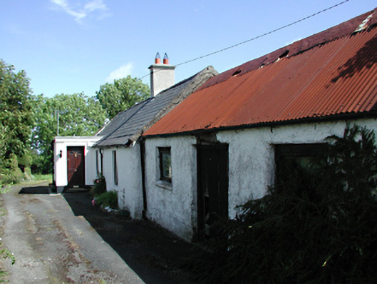 Linear group of farm buildings, c.1820. Three-bay single-storey house with roughcast rendered walls, timber casement windows and a pitched slate roof with rendered chimney stack. Later flat-roofed porch extension. Three-bay single-storey former barn to south with roughcast rendered walls, timber windows and a corrugated iron roof. Four-bay dwelling to north with rendered, ruled and lined walls, timber casement windows and a pitched slate roof. Corrugated iron privy to rere.