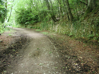 Surviving section of cobbled military road within Massy's Woods, c.1780. Bridge over the Owendoher with cyclopean stonework leads to best preserved section of road beneath revetment walls, and showing cobbled gutters. Further west the road becomes a forest track and vanishes into woodland beneath modern Killakee Road.