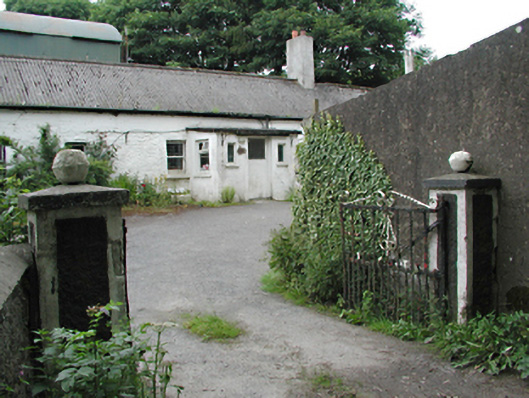 Detached five-bay single-storey farm house, c.1870. Painted random rubble and smooth rendered walls, raised with mass concrete at eaves level. Timber sash windows. Glazed timber door in projecting flat-roofed porch extension. Pitched corrugated asbestos sheet roof with a single rendered chimney stack. Several rubble stone barns surround courtyard, most with circular vent holes and corrugated iron roofs, and some with brick dressings to openings. Rendered gate piers with iron gates to entrance.