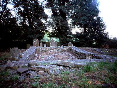 Graveyard with various cut stone grave markers from c.1575 to present. Ruin of single-cell church [SMR DU005-024001-].