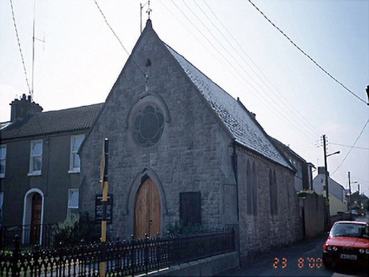 Corner-sited semi-detached gable-fronted Methodist church, built 1880, with three-bays to side elevation. ROOF: Double pitched; artificial slate; concrete ridge tiles; cast-iron cross to apex of front gable; cast-iron rainwater goods; stone coping. WALLS: Snecked rockfaced limestone; buttresses to corners; brick corbels to eaves. OPENINGS: Gothic arched door opening; limestone hood moulding; tongue and groove double doors; rose window to gable with hood moulding; pointed arched bi-partite windows to side elevation with quoined limestone surrounds; red brick to rear elevation windows; small trefoil opening to front gate