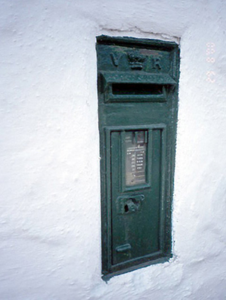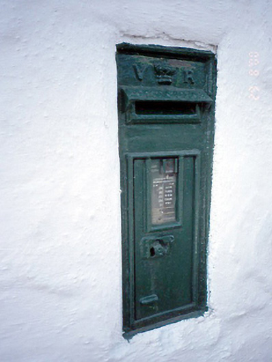 Wall-mounted cast-iron post box, c.1885, with royal 'VR' monogram.