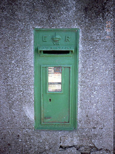 Wall-mounted cast-iron post box, c.1905, with 'ER VII' monogram.