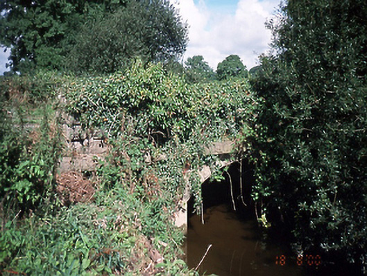 Single-arch rubble stone road bridge over river, c.1860, with rock faced limestone to parapet wall and rounded capping.