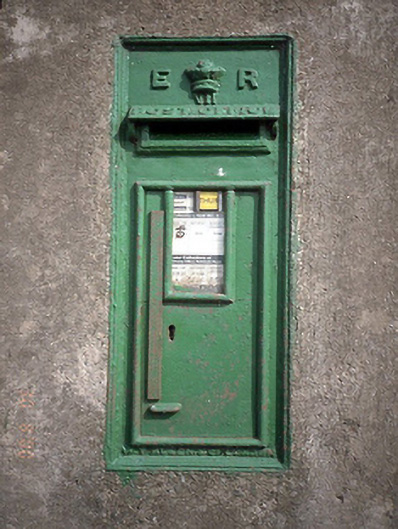 Wall-mounted cast-iron post box, c.1905, with 'ER VII' monogram. Set into gate pier of Corduff House.