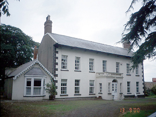 Detached seven-bay two-storey farmhouse, c.1840, on a T-shaped plan with central projecting balustraded entrance porch. Single-bay single-storey gable-fronted extension, c.1880, to left-hand side having canted bay window. Farmyard, c.1840, to rear. ROOF: Double pitched slate roof with terracotta ridge tiles; red brick chimney stacks at gable ends with terracotta pots; overhanging eaves and ornate barge boards to extension with timber finial. WALLS: Nap rendered, ruled and lined with quoins; nap rendered entrance porch with moulded cornice and balustrade; rubble stone stable buildings. OPENINGS: Square headed with nap rendered reveals; stone cills; 6/6 timber sash and uPVC casement windows; roundheaded door with rolled moulding and rendered key stone; uPVC door; square headed door with porch with flat panelled and glazed door; uPVC side lights; probably original timber tongue and grooved timber doors to stable.