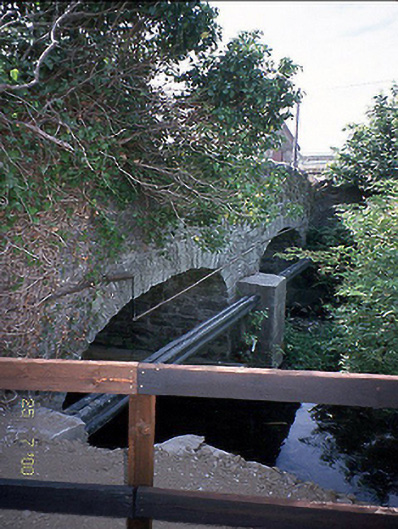 Double-arch rubble stone humpback road bridge over river, c.1880.