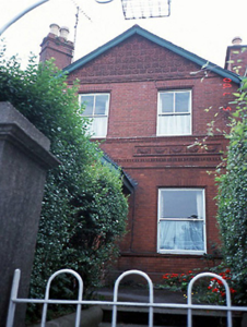 Semi-detached two-bay two-storey gabled-fronted red brick house, c.1910, with single-bay single-storey gabled projecting entrance porch to ground floor. ROOF: Gable-fronted; slate; red clay ridge tiles; diagonally-set red brick chimney stacks; yellow clay pots; timber eaves; cast-iron rainwater goods; gable-fronted to porch. WALLS: Red-brick; Flemish bond; red brick dressings including plinth and chamfered string courses;terracotta dressings including raised panels and decorative gable with garland and festoon, sunflower and rosette mouldings. OPENINGS: Square-headed; red brick continuous sill course; chamfered reveals; 1/1 timber sash windows to ground floor; 2/2 timber sash windows to first floor; fielded architrave to porch; timber casement window; door opening to side elevation; timber pilaster doorcase; consoles; timber panelled door overlight; round window opening over; timber fixed-pane window.