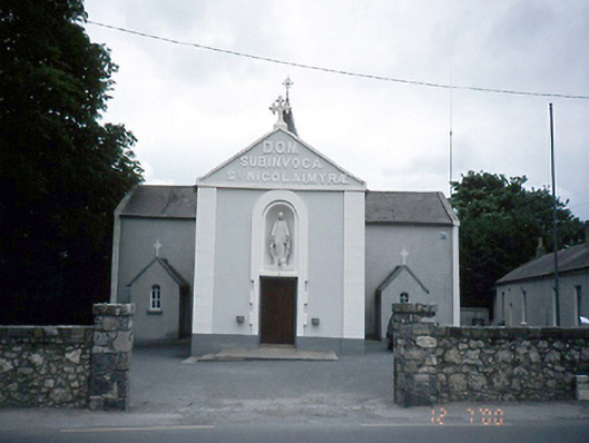 Detached gabled-fronted Catholic church, c.1840, on a cruciform plan with two-bay side elevation to nave. Single-bay transepts which have gabled porches attached to west elevations, and single-bay sacristy with gabled porch attached to south elevation. Tower and spire to east. ROOF: Double-pitched; slate with granite ridge tiles and coping; pyramidal slate roof to tower crowned by wrought iron cross; some original cast-iron rainwater goods. WALLS: Nap rendered front wall with raised lettering within pediment and having statue of the Virgin contained within a niche; stone cross crowns gable; pebbledash side walls. OPENINGS: Square headed granite surround to main door; timber panelled door; round and square headed; rendered reveals; stone cill; timber sash windows with coloured glass margin panes.