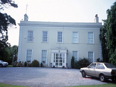 Detached five-bay two-storey house, c.1830, with return to rear. Central projecting Doric entrance porch to east elevation, c.1840. uPVC conservatory to south elevation, c.1990. ROOF: Hidden behind parapet wall with two nap rendered chimney stacks at gable ends. WALLS: Nap rendered with a nap rendered moulded cornice and quoins. uPVC conservatory, c.1990, to right hand side elevation. OPENINGS: Squareheaded windows with nap rendered moulded architraves, stone cills and 6/6 timber sash windows. Projecting entrance porch with timber flat panels and glazing to sides and quarter engaged, nap rendered Doric columns