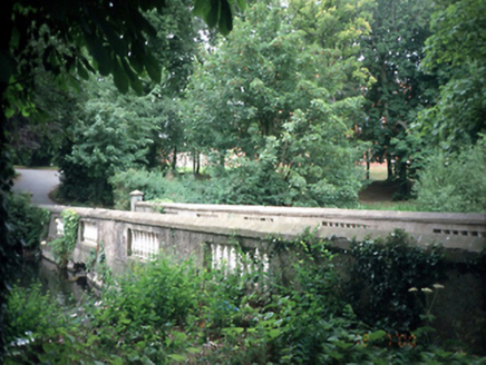 Single-arch concrete road bridge over river, c.1850. Balustraded parapet with cast-iron balusters.