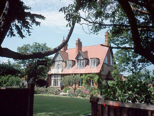 Detached four-bay single-storey red brick house with dormer attic, c.1920, with single-storey box window to west having balcony above. Veranda to rear elevation. Outbuilding to east. ROOF: Double-pitched clay tiles; red clay ridge tiles; red brick chimneys; terracotta stacks overhanging timber eaves; cast-iron rainwater goods; gable-fronted and flat-roofed to dormer attic windows. WALLS: Red brick to ground floor; nap rendered to left dormer attic window; unpainted; nap rendered to first floor side and rear elevations with 'timber frame' dressings; painted. OPENINGS: Square-headed openings; concrete sills; timber casement windows with leaded panes; box bay window to left; timber panelled door; sidelight; timber panelled door to left dormer attic window; timber balcony.