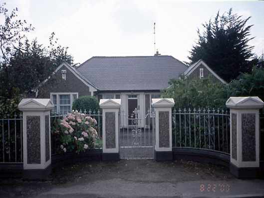 Detached five-bay single-storey presbytery, c.1900, with gabled projecting end bays. Entrance piers with cast-iron railings. ROOF: Hipped slate roof with end double pitched roofs; tall rendered chimney stack; all with clay ridge tiles; cast-iron rainwater goods. WALLS: Pebble dashed with smooth rendered plinths, corner verticals and line below gutters. OPENINGS: Two square headed tripartite window openings; patent rendered soffits, reveals and cills surrounding central 6/6 timber sash window with flanking 2/2 timber sash windows; other square headed window openings with 6/6 timber sashes windows; square headed door opening with rendered doorcase; simple cornice; modern hardwood doorleaf with triple paned overlight.