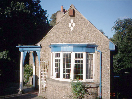 Detached two-bay single-storey gate lodge, c.1930, with timber entrance porch to left-hand side. Two-storey to rear elevation. ROOF: L-shaped roof plan with intersecting hipped and double pitched slate roof; rendered chimney stack with terracotta pots; cast-iron rainwater goods; over hanging timber eaves resting on timber blocks; square headed door opening with rendered reveals and soffit, timber panelled door. WALLS: Pebble dashed. OPENINGS:Timber porch with pillar on granite blocks; square headed timber panelled door; five light timber casement window with metal transoms and mullions placed in bow projection; square headed; render reveals granite cills 1/1 timber sashes.