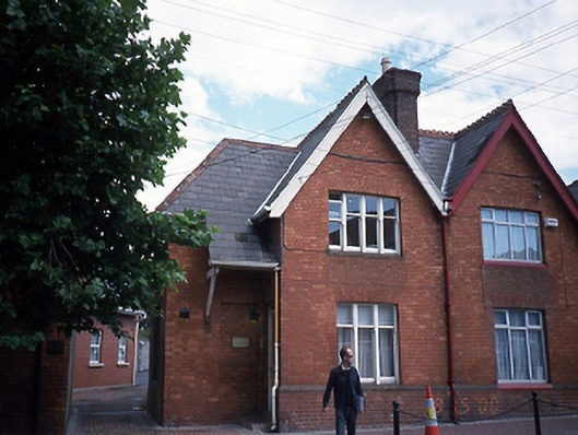Semi-detached two-bay two-storey red brick house, c.1900, with projecting gabled bay and return to rear. (Pair with 11362007) ROOF: Double pitched slate with terracotta tiles; hipped slate roof to left with terracotta ridge tiles; roof extends down to form roof porch over door; cast-iron rainwater goods; timber barge boards, overhanging eaves supported by timber bracket on sandstone console. WALLS: Machine made red brick, Flemish bond, flush pointing, sandstone ground floor cill course, ruled and lined, nap rendered side elevation. OPENINGS: Camber headed window opening, red brick flat arch, soffit, reveals and flush chamfered sandstone cills and tripartite and quadripartite single-pane sash windows with ogee horns, square headed door opening, red brick flat arch, soffits, reveals; rendered door step with tiling and glazed timber door leaf with frosted glass overlight.