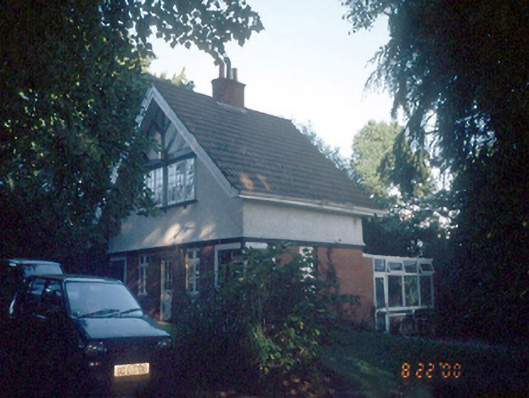 Detached gable-fronted five-bay two-storey half timber neo-Tudor gate lodge, c.1900. Conservatory to rear, c.1980. ROOF: Double pitched; tiled; overhanging timber eaves and barge boards; corniced red brick stack with modern terracotta pots. WALLS: Machine made red brick; Flemish bond; moulded red brick plinth course; rough cast render walls at first floor level, timber latching to uppermost part of façade. OPENINGS: Centrally placed timber and glass panelled door with brick soffits and reveals; timber casement windows; ground floor corner windows with carved timber porch.