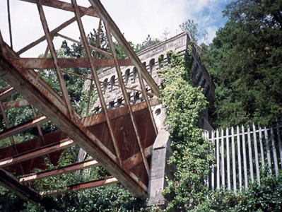 Single-span cast-iron girder footbridge over river, c.1850, with rock faced cut limestone piers having base batters and round-headed arches. Now disused. NOTE: Variously known as "Farmleigh Bridge", "Guinness Bridge", "Silver Bridge" and "Strawberry Beds Bridge".