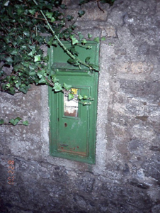 Wall-mounted cast-iron post box, c.1920. Located in limestone rubble wall at cross road between Porterstown / Carpenterstown and the Sandpits.