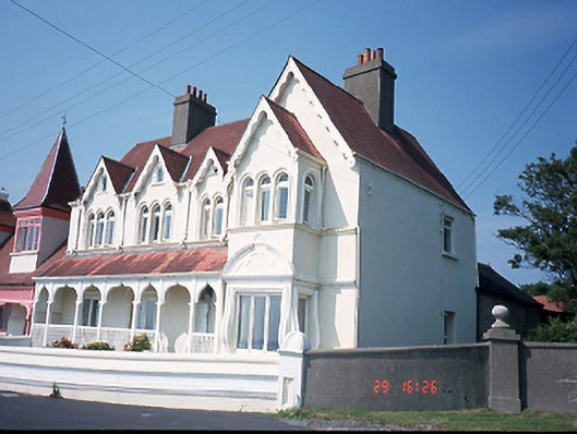 Semi-detached four-bay two-storey house with gablets to dormer attic, c.1900, with advanced gabled end bay to right. Ornate timber veranda to ground floor. ROOF: Double pitched red tile with gable fronted section to right; timber barge boards; cast iron rainwater goods. WALLS: Smooth rendered with plaster decoration; balustraded timber veranda. OPENINGS: uPVC casement windows and doors. Original stained glass fanlight to windows.