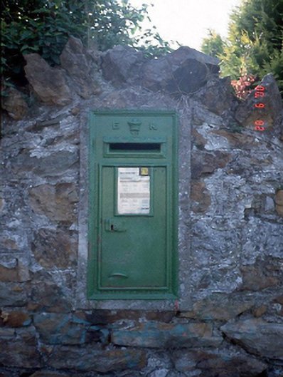 Wall-mounted cast-iron post box, c.1905, with raised 'ER' monogram.