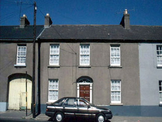 Terraced three-bay two-storey house, c. 1871, with segmental-headed doorcase having fanlight and two-storey return.