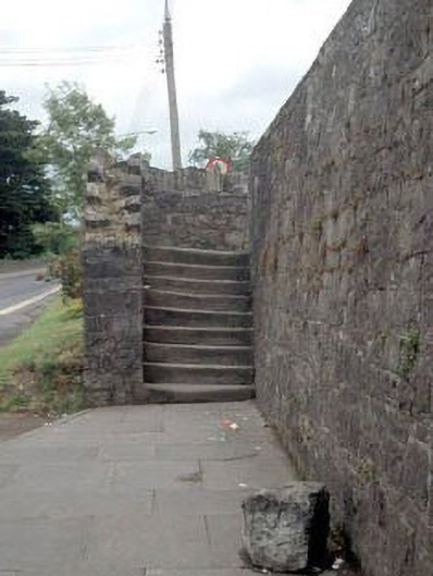 Length of coursed rusticated limestone and granite retaining wall, c. 1845, dividing split-level street. Flight of granite steps on north side, with cut granite and roughly crenellated coping stones.