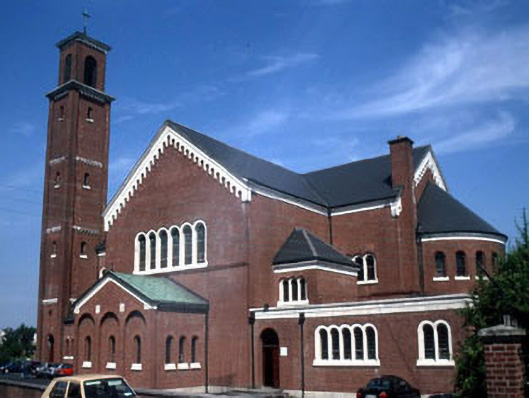 Cruciform plan neo-Romanesque Catholic church, built 1960-4, with apsidal chancel, square bell tower, octagonal baptistery, projecting portico, side porches and single-storey offices adjacent.