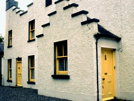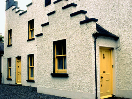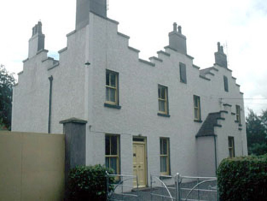 Detached four-bay two-storey house with crow stepped parapet, c. 1874. Extended to east side with projecting porch, dwelling and surgery to north and conservatory to south.