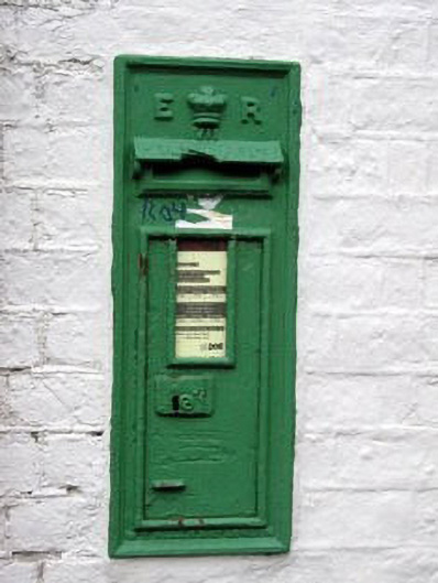 Cast-iron wall-mounted letter box, c. 1905, with moulded frame and canopy over slot.