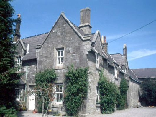 Four-bay two-storey former Victorian Tudor model farm residence, built 1851, now private house. Four-bay two-storey stables and outhouses to rear and half-dormer upper floor. Gabled dormers, projecting single-storey porch and integral carriageway arch to rear. Front garden with cut limestone square piers, having peaked caps, rubble street wall and courtyard to rear.