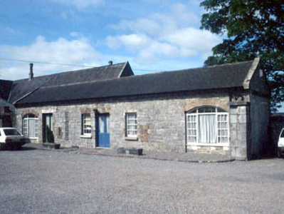 Former model farm stables, built 1851, six-bay single-storey converted c. 1990 to apartment and nursery school. Limestone ashlar gate pier adjoining north end.