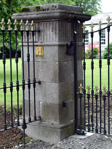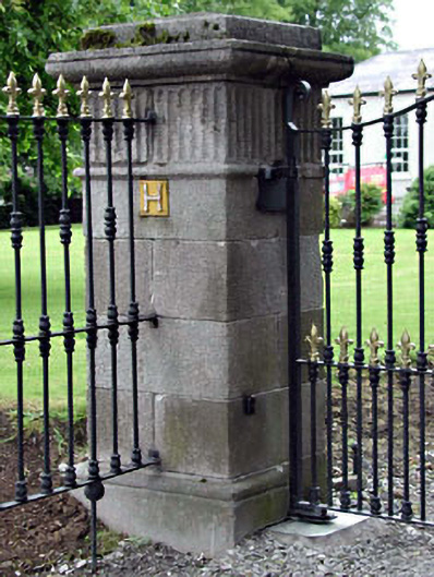 Gateway, c.1800, comprising pair of cut-stone piers with fluted friezes, moulded capping and pair of cut-stone terminating piers. Renovated, c.2000, with replacement cast-iron double gates and railings inserted.
