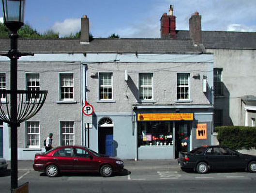 Terraced three-bay two-storey double-pile house, c.1820, with round-headed door opening to left ground floor. Reroofed and renovated, c.1980, with openings remodelled to right ground floor to accommodate commercial use. Gable-ended double-pile (M-profile) roof (shared) behind parapet wall. Replacement fibre-cement slate, c.1980. Concrete ridge tiles. Roughcast and rendered chimney stacks. Rendered coping to gables. Cast-iron rainwater goods. Rendered wall to ground floor (possibly replacement). Painted. Roughcast walls to remainder. Painted. Rendered dressings including strips to ends and parapet wall having cut-stone coping. Square-headed window openings to first floor. Stone sills. Replacement uPVC casement windows, c.1990. Round-headed door opening to left ground floor. Timber panelled door. Spoked fanlight. Openings remodelled, c.1980, to right ground floor with fixed-pane timber display window and glazed timber door having timber panelled fascia over. Road fronted. Concrete footpath to front.