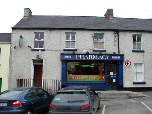 Terraced three-bay two-storey house, c.1850, retaining early fenestration to first floor. Reroofed, c.1960. Renovated, c.1995, with entrance reoriented and timber shopfront inserted to right ground floor. One of a pair. Gable-ended roof. Replacement artificial slate, c.1960. Clay ridge tiles. Roughcast chimney stacks over red brick construction. Cast-iron rainwater goods on eaves course. Roughcast walls. Unpainted. Square-headed window openings (remodelled, c.1995, to left ground floor to accommodate use as door opening. Stone sills. 2/2 timber sash windows (some with cylinder glazing). Replacement timber panelled door, c.1995. Overlight. Timber shopfront, c.1995, to right ground floor with panelled pilasters, fixed-pane timber display window and glazed timber door having timber fascia over on paired consoles and moulded cornice. Road fronted. Concrete footpath to front.