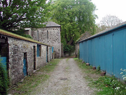 This outbuilding is an attractive long, low rubble stone range that forms an integral component of the Leixlip Castle estate. The building is of some social and historical significance, attesting to the expansion of the estate in the late eighteenth century. The rubble stone construction is a feature shared in common with further buildings in the grounds and is representative of the traditional economic method of building at the time. A distinguishing feature is the almost entirely timber-clad front (south-east) elevation, composed of a series of timber boarded double doors fronting square-headed integral carriageways. Well-maintained, the outbuilding retains much of its original form and character. Also of interest is the stone cobbling to the laneway to south-east, which has elsewhere been replaced or covered with tarmacadam.