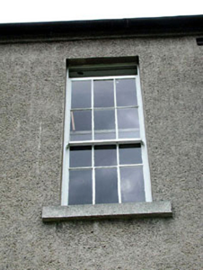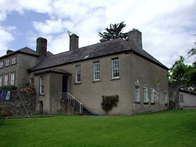 Attached five- or six-bay single-storey over raised basement house, built 1749, on an L-shaped plan centred on single-bay single-storey gabled projecting lower porch. Pitched and hipped slate roof on an L-shaped plan; hipped slate roof (porch), clay ridge tiles, rendered red brick Running bond chimney stacks having stringcourses below capping, and cast-iron rainwater goods on rendered stepped eaves with cast-iron downpipes. Lime rendered or roughcast coursed rubble limestone walls with concealed cut- or hammered limestone flush quoins to corners. Square-headed window opening (porch) with cut-granite sill, and concealed dressings framing six-over-six timber sash window. Camber-headed door opening approached by flight of nine steps between wrought iron railings with concealed dressings framing timber panelled door having overlight. Square-headed window openings with cut-granite sills, and concealed dressings framing six-over-six timber sash windows. Square-headed window openings in camber-headed recesses (basement) with cut-granite sills, and concealed dressings including cut- or hammered limestone voussoirs framing six-over-six timber sash windows having part exposed sash boxes behind wrought iron bars. Set in landscaped grounds with margined tooled limestone ashlar piers to perimeter having cut-limestone shallow pyramidal capping supporting spear head-detailed cast-iron double gates.