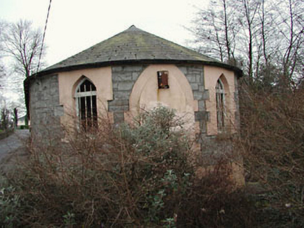Detached ten-bay single-storey national school, dated 1845, on a bow-ended symmetrical plan; three-bay single-storey side elevations. Now disused. Bow-ended hipped slate roof with clay ridge tiles, and cast-iron rainwater goods on rendered eaves. Repointed coursed or snecked limestone walls originally roughcast on rendered chamfered plinth. Square-headed window openings centred on cut-limestone date stone ("1845") with cut-granite sills, and rendered surrounds framing timber casement windows behind wrought iron bars. Pair of round-headed flanking door openings with rendered surrounds framing "fanlight"-detailed rendered infill. Pointed-arch door openings (side elevations) with rendered block-and-start surrounds framing rendered infill. Pointed-arch flanking window openings with cut-limestone sills, and rendered block-and-start surrounds framing timber casement windows behind wrought iron bars. Road fronted with concrete footpath to front.