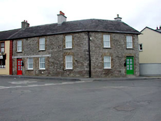 End-of-terrace six-bay two-storey rubble stone former Royal Irish Constabulary barracks, c.1840, on a cranked plan on a corner site with four bays facing to south-east and two bays facing to east. Extensively renovated and divided, c.1995, to accommodate use as two separate houses. Gable-ended roof on a cranked plan. Replacement artificial slate, c.1995. Concrete ridge tiles. Rendered chimney stacks. Cast-iron rainwater goods. Rubble limestone walls. Cut-stone quoins. Square-headed openings. Stone sills. Yellow brick dressings. Reconstituted stone lintel inserted, c.1995, over openings to left ground floor having keystones. Replacement 1/1 timber sash windows, c.1995. Replacement glazed timber panelled doors, c.1995, with overlights. Road fronted on a corner site. Concrete footpath to front.
