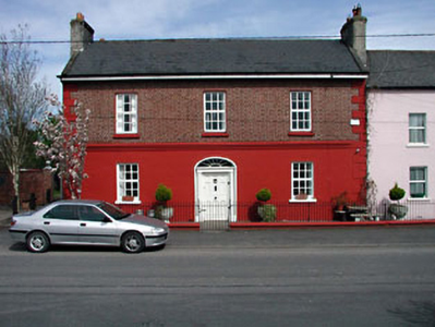 End-of-terrace three-bay two-storey double-pile house with dormer attic, c.1810, with segmental-headed door opening to centre. Refenestrated, c.1990. Gable-ended double-pile (M-profile) roof with slate. Clay ridge tiles. Roughcast chimney stacks. Rendered coping to gables. Overhanging timber eaves. Cast-iron rainwater goods. Rendered walls to ground floor. Ruled and lined. Painted. Moulded stringcourse to first floor. Red brick Flemish bond walls to first floor. Rendered quoins to corners. Roughcast walls to remainder. Unpainted. Square-headed openings. Rendered sills. Replacement timber casement windows, c.1990, to front (south-west) elevation. Replacement uPVC casement windows, c.1990, to remainder. Segmental-headed door opening. Columnar doorcase with entablature. Timber panelled door. Spoked fanlight. Road fronted. Section of iron railings to front with iron gate.