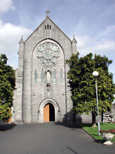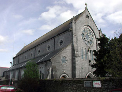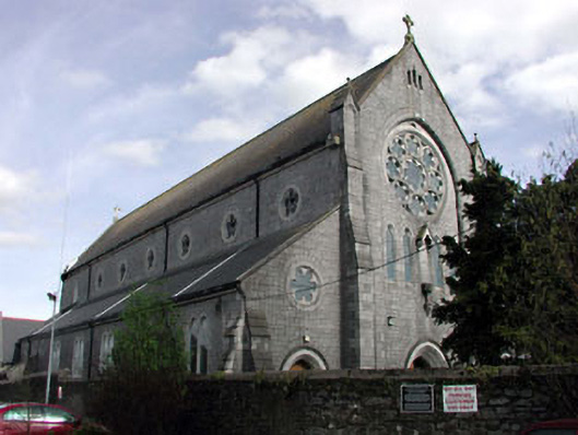 Detached seven-bay single- and two-storey Gothic Revival Catholic church, built 1876-84, comprising seven-bay double-height nave with seven-bay single-storey lean-to side aisles to north-west and to south-east, single-bay single-storey gabled lower projecting bays to north-east and to south-east (including sacristy projection), and entrance bay to south-west. Gable-ended (gable-fronted) roof with slate (behind parapet to gables) (lean-to to side aisles; gabled to projecting bays). Clay ridge tiles. Red clay ridge tiles to projecting bays. Cut-stone coping to gables with cross finials to apexes. Cast-iron rainwater goods on cut-stone eaves band. Coursed snecked limestone walls. Cut-limestone dressings including stepped clasping buttresses with triangular finials. Cut-limestone parapet walls to gables. Paired lancet-arch window openings to side aisles (grouped (four) over entrance to south-west). Cut-stone surrounds. Fixed-pane windows (some with stained glass fittings). Cinquefoil windows to clere-storey (and over entrances to side aisles) in cut-stone medallion surrounds. Fixed-pane windows. Traceried (five-light) window to chancel (north-east) with cut-stone surround having hood moulding over. Decorative rose window over entrance to south-west in lancet-arch frame comprising series of cinquefoil windows with cut-limestone frames. Pointed-arch door openings. Cut-limestone surrounds. Cut-stone voussoirs. Diagonal tongue-and-groove timber panelled double doors. Set back from road in own grounds. Tarmacadam forecourt to front. Freestanding belfry, c.1880, to south-west comprising cut-stone plinth with cast-iron bell over. Gateway, c.1880, to south-west comprising pair of cast-iron panelled piers with cast-iron gates and railings having rendered outer piers.