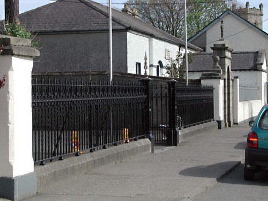 Saints Patrick and Brigid's’ Catholic Church is a fine and imposing building in a severe Gothic Revival style. The church, which is set slightly back from the line of Main Street, Clane, is nevertheless an imposing feature in the locality, being the largest structure in the town, and dominates its surroundings. The entrance (south-west) front, although pierced by numerous openings including the finely detailed rose window, presents an austere façade to the street line, and is attractively framed by the school to south-east and further buildings to north-west. The construction of the church in cut-stone is a fine example of the high quality of stone masonry practised in the locality, and this is especially apparent in the detailing, including intricate surrounds to the window openings, door openings, and so on. The scale and detailing of the church confirm the social importance of the building in Clane and attests to the growing confidence of the Catholic community in the late nineteenth century. The retention of important early salient features to the exterior suggest that the original interior may remain intact - stained glass panels of artistic importance are incorporated in the window openings. The belfry to south-west is of some technical interest and retains its original mechanisms. The church is announced on the main street by a fine and decorative gateway, of artistic interest, that is a good example of early cast-iron work.